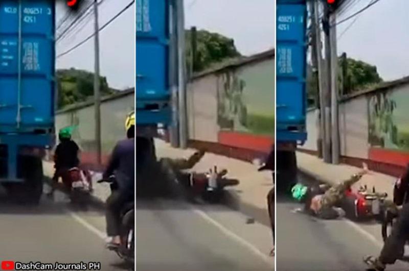 Camión pasó por encima de la cabeza de un motociclista y este se levantó como si nada