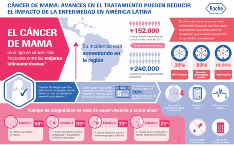 Por ejemplo, en América Latina se estima que entre el 30% y 40% de los casos de cáncer de mama se diagnostican en etapa metastásica, mientras que las tasas de supervivencia a 5 años luego de la detección, no superan el 70%, un porcentaje muy bajo en comparación con países desarrollados.