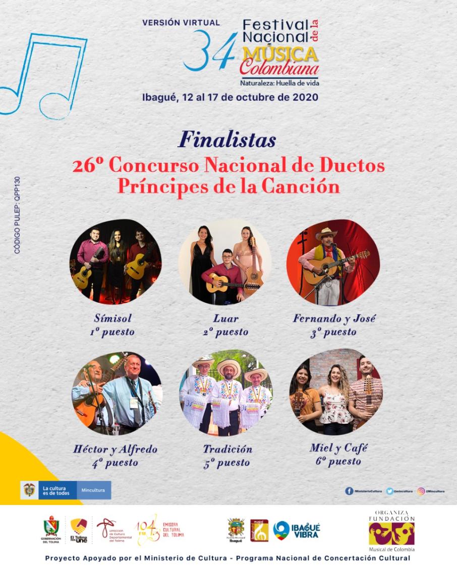 El Dueto Simisol conformado por Lizeth Paola Rodríguez Díaz, primera voz, y Sebastián Nieto Zapata, segunda voz y guitarra, con el acompañante de Óscar Iván Navarro Restrepo en el tiple, conquistó al jurado conformado por José Luis Martínez Vesga, Sofía Helena Sánchez Messier, Édgar Leonardo Puentes Melo, Carlos Godoy Berroteran y Florentino Camacho Valderrama, con sus impecables interpretaciones en la ronda eliminatoria y en la gran final, esta última en la que deleitó con “Mi país”, bambuco de Guillermo Calderón Perdomo y “Caballito de Ráquira”, torbellino de Gustavo Adolfo Rengifo.