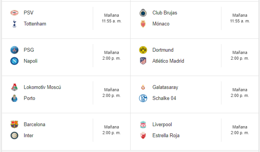 En otros resultados, Ajax superó al Benfica y asumió el liderato del grupo E, Real Madrid derrotó 2-1 al Victoria Plzeñ, la Roma goleó 3-0 al CSK de Moscú, Shacktar cayó en casa 0-3 frente al Manchester City y Hoffenheim empató a tres goles con Lyon. Así se jugarán los partidos de mañana: