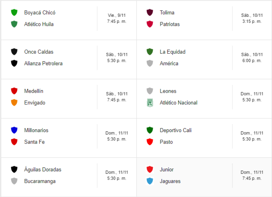 De igual manera, Once Caldas hará lo propio frente a Alianza Petrolera, La Equidad con América de Cali y Deportivo Independiente Medellín ante Envigado. Entre tanto, la programación para el día domingo comprende los siguientes choques, todos a las 5:30 de la tarde: