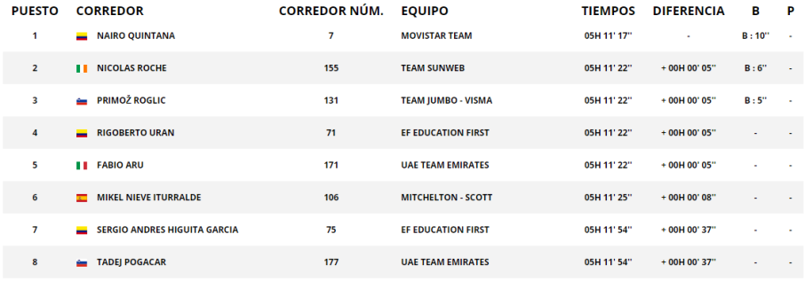 La jornada también resultó beneficiosa para Rigoberto Urán, que ocupó la cuarta plaza y escaló a la tercera casilla en la clasificación general. Por su parte, Sergio Andrés Higuita García terminó el recorrido de hoy en el séptimo puesto y de esa manera se mantuvo en el top 10 del cuadro principal.