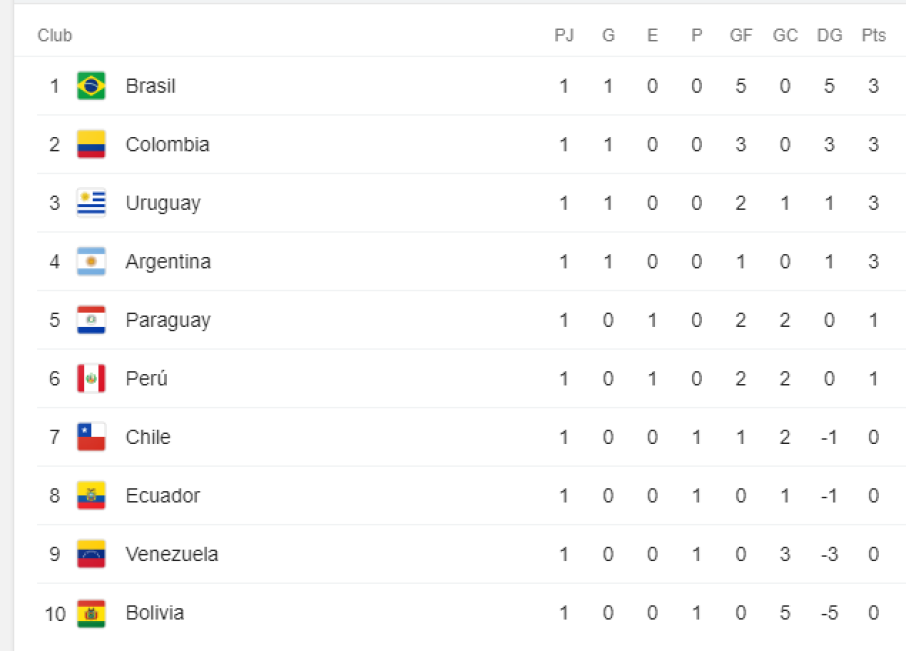 Precisamente, Brasil, Colombia, Uruguay y Argentina se pusieron al frente de la clasificación con tres unidades cada uno, seguidos por Paraguay y Perú que sumaron de a un punto tras empatar a dos goles en Asunción, mientras que 'en blanco' aparecen Chile, Ecuador, Venezuela y Bolivia.