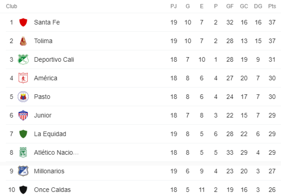 A falta de una jornada para terminar la fase ‘todos contra todos’, Santa Fe está al frente de la clasificación con 37 puntos y +16 en la diferencia de gol, seguido por los de Ibagué con las mismas unidades y +15 en el balance de anotaciones. Cali, América, Junior, Pasto, La Equidad y Nacional completan el lote clasificatorio.