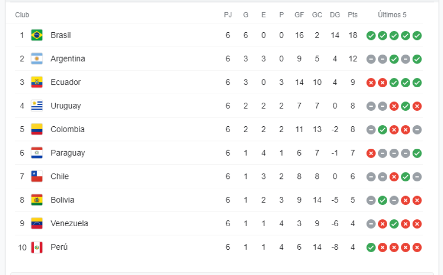 Colombia ocupa parcialmente el quinto lugar en la tabla de posiciones con 8 puntos, mientras que Brasil comanda la clasificación con 18 unidades, seguido por Argentina y Ecuador. Los peruanos son últimos con cuatro derrotas consecutivas.