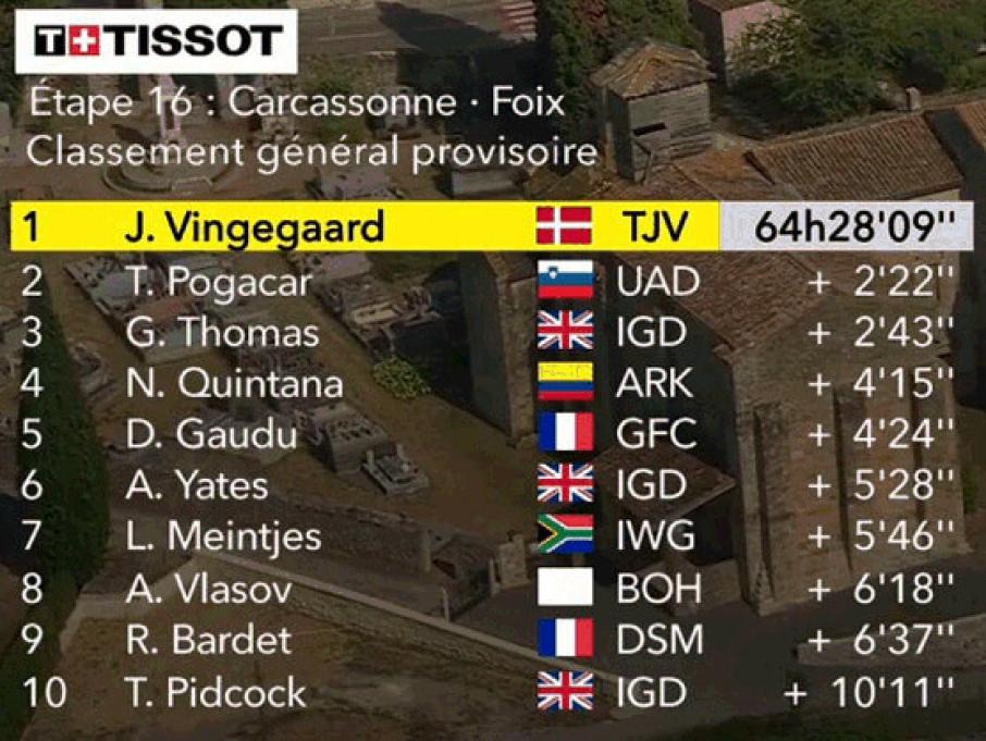 A la fecha, el esloveno Tadej Pogacar del UAE Emirates, se encuentra ubicado en la segunda casilla, mientras que, el británico Geraint Thomas del Ineos Grenadiers está de tercero y Nairo Quintana de cuarto con el gran objetivo de seguir descontando segundos y lograr pasar del top 5 al top 3.