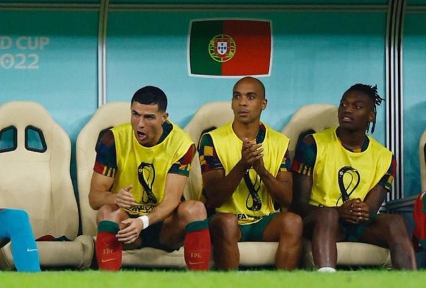 El jugador estrella Cirstiano Ronaldo, quien no fue titular en los octavos de final, continúa en el banco de suplentes mientras celebra el triunfo de su equipo tras cada gol, como el que anotó Pepe en el primer tiempo.
