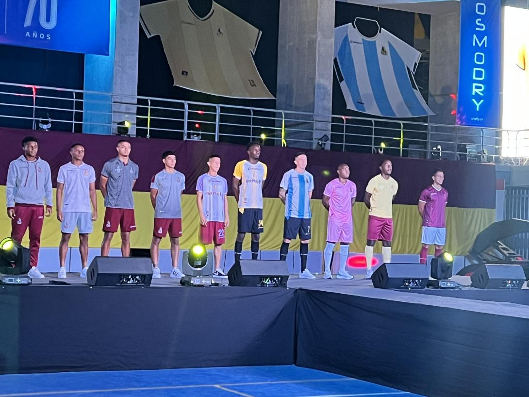Luego, se procedió a revelar la camiseta "El Dorado", de color dorado con sutiles líneas verticales en vinotinto, que servirá como segunda equipación en esta temporada. Finalmente, se llegó al momento tan esperado por todos los asistentes: la presentación de la camiseta "70 Años" y la principal para el 2024, un uniforme con camiseta vinotinto y sutiles toques de dorado, acompañado de pantaloneta blanca.