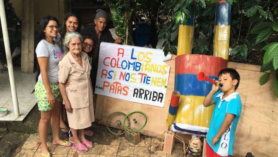 La caravana de la alegría sigue recorriendo los barrios y visitando a los participantes de este año, el día de hoy el turno fue para Villa Pinzón en la Comuna 3, donde el reconocido líder Ramiro Delgadillo y su familia presentaron a su creación: A los colombianos así nos tienen… patas arriba.