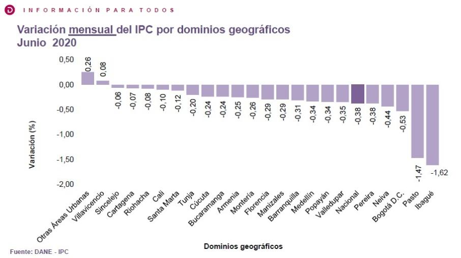 En el mes de junio de 2020, el IPC registró una variación de -0,38% en comparación con mayo de 2020, ocho divisiones se ubicaron por encima del promedio nacional (-0,38%): Salud (0,33%), Bebidas alcohólicas y tabaco (0,21%), Educación (0,00%), Restaurantes y hoteles (- 0,04%), Información y comunicación (-0,06%), Alimentos y bebidas no alcohólicas (-0,11%), Recreación y cultura (-0,16%) y por último, Bienes y servicios diversos (-0,23%). Por debajo se ubicaron: Transporte (-0,53%), Alojamiento, agua, electricidad, gas y otros combustibles (- 0,53%), Muebles, artículos para el hogar y para la conservación ordinaria del hogar (-0,58%) y por último, Prendas de vestir y calzado (-2,06%).