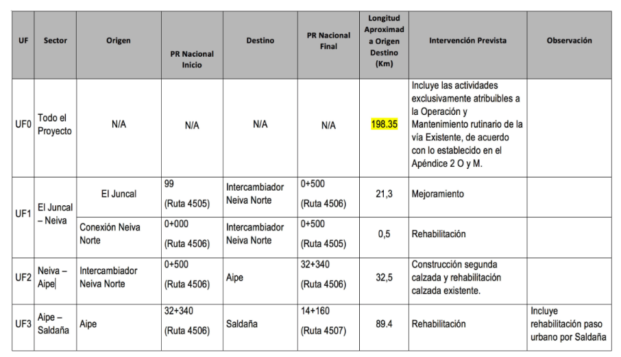 El proyecto constaba inicialmente de 5 Unidades funcionales que en la actualidad se convirtieron en 7, de las cuales se realizan en su mayoría en el Tolima, cuenta con dos oficinas principales, una ubicada en la capital Huilense y otra en el municipio del Espinal. Los municipios que se involucran dentro de este proyecto son Rivera, Palermo, Neiva, Aipe, Natagaima, Coyaima, Saldaña, Guamo, Espinal, Flandes y Girardot.