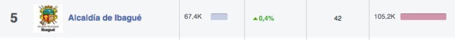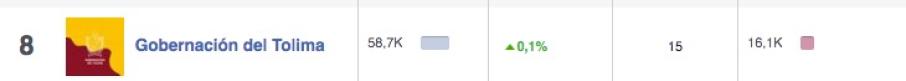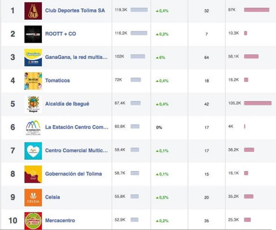 En primer lugar sorprende con 119.300 fans el Club Deportes Tolima, un número mínimo por tratarse del equipo que representa un departamento con más de 1.400.000 habitantes, la empresa ROOT+CO registra 116.200 y positivamente, con un amplio portafolio de servicios en el tercer lugar, se destaca la red multiservicios GanaGana con 102.000 fans, la sigue la firma Tomaticos con 72.000 y la Alcaldía de Ibagué en el quinto lugar con 67.400.