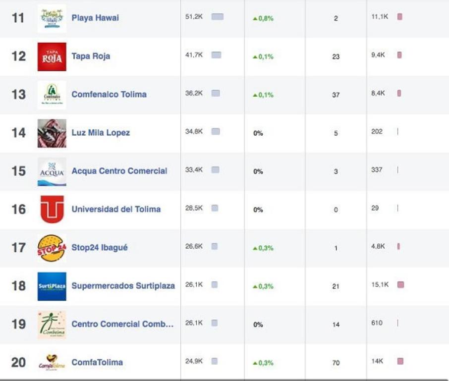 En el lugar once de preferencia Playa Hawai con 51.200 fans, seguido de Tapa Roja, Comfenalco Tolima, Luz Mila López y el Centro comercial Acqua, que cierra este bloque con 33.400 fans, ubicándose en el lugar 15 del escalafón.