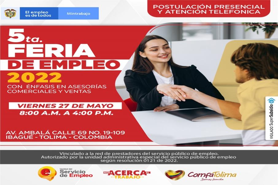 En esta oportunidad, durante la quinta edición de la Feria de Empleo 2022 ComfaTolima, estarán disponibles más de 120 vacantes en las distintas áreas del Tolima y el énfasis de esta versión estará enmarcado en lo que corresponde a Asesoría Comercial y Ventas.