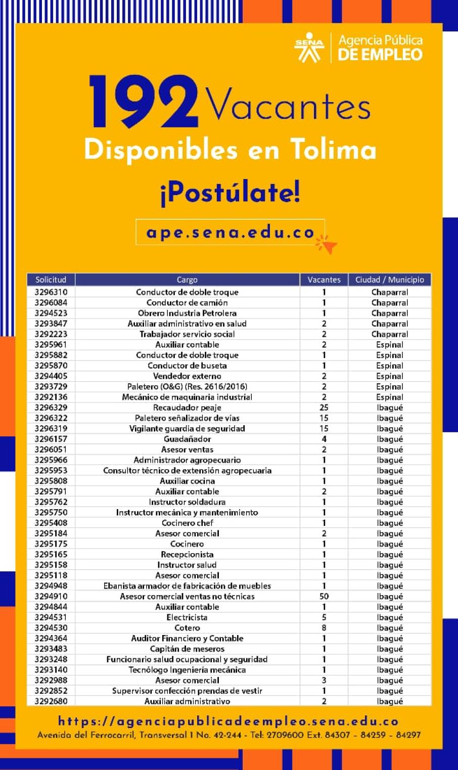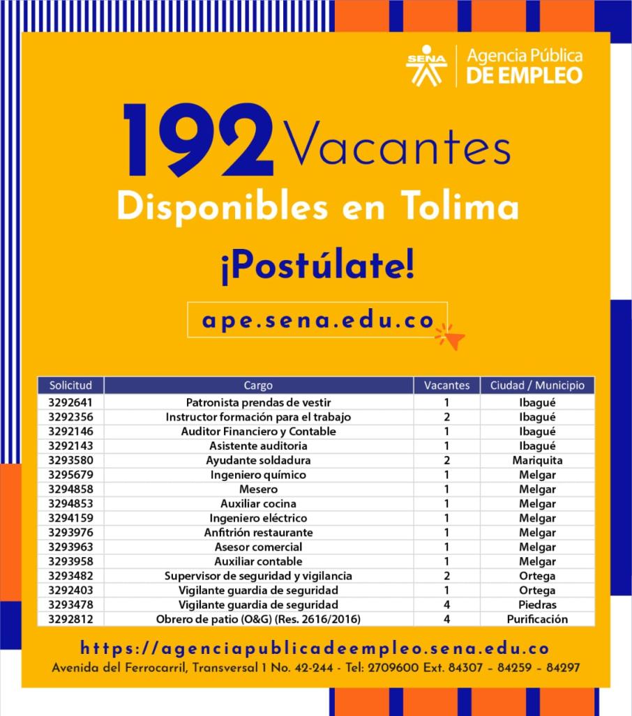Vale la pena señalar que además de la ciudad de Ibagué, también existen vacantes en municipios como Mariquita, Melgar, Ortega, Piedras, Purificación, Chaparral y Espinal.