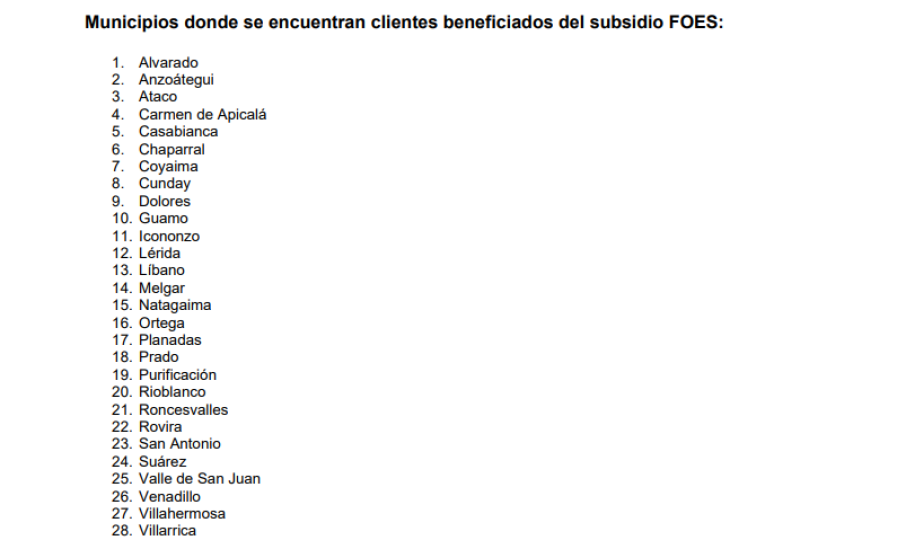 63 mil clientes de Celsia de 28 municipios del Tolima y algunos de Ricaurte en Cundinamarca comenzaron a recibir un nuevo subsidio sobre el consumo de energía. Se trata del subsidio FOES, Fondo de Energía Social (Decreto 111 del 2012) el cual es otorgado por el Estado y administrado por el Ministerio de Minas y Energía a sectores catalogados como áreas rurales de menor desarrollo y zonas de difícil gestión.