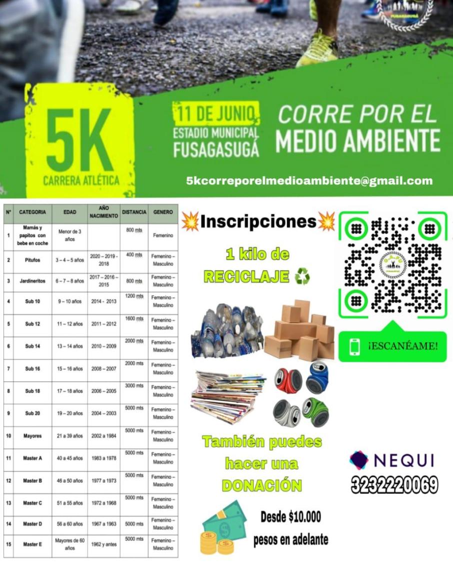 El domingo 11 de junio, desde las 7 de la mañana, se realizará la primera versión de la carrera "Corre por el Medio Ambiente" en el estadio municipal de Fusagasugá, una oportunidad única para unir el deporte y la protección del planeta en una sola actividad Niños, niñas y adultos tendrán la posibilidad de participar en 15 categorías diferentes, fomentando la inclusión y el espíritu de comunidad.