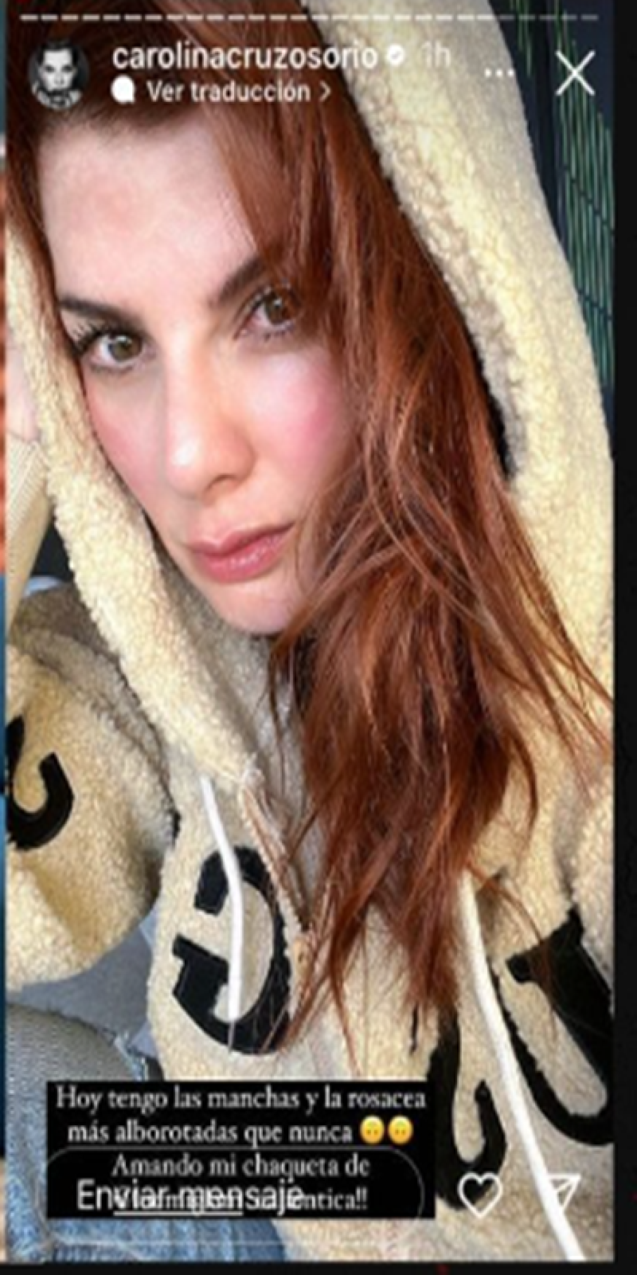 “Hoy tengo las manchas y la rosácea más alborotadas que nunca”, comentó Carolina Cruz en su historia de Instagram.