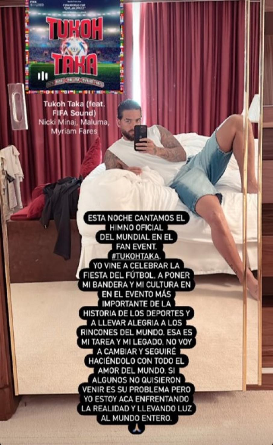 “Yo vine a celebrar la fiesta del fútbol, a poner mi bandera y mi cultura en el evento más importante de la historia de los deportes”, escribió Maluma, quien además dejó claro que: “no voy a cambiar y seguiré haciéndolo con todo el amor del mundo. Si algunos no quisieron venir es su problema, pero yo estoy acá enfrentando la realidad y llevando luz al mundo entero”, concluyó.