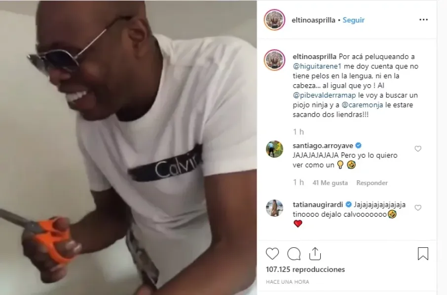 El ‘Tino Asprilla’ compartió un video en Instagram junto a ‘Pibe Valderrama’ y Rene Higuita, en una habitación de hotel donde se le ve muy emocionado y contento, el ex jugador con "tijera en mano" empieza hacer comentarios sobre su amigo y colega, pero al momento de cortar, solo le quita una pequeña parte de una de sus puntas. Este video ha causado risas entre sus seguidores
