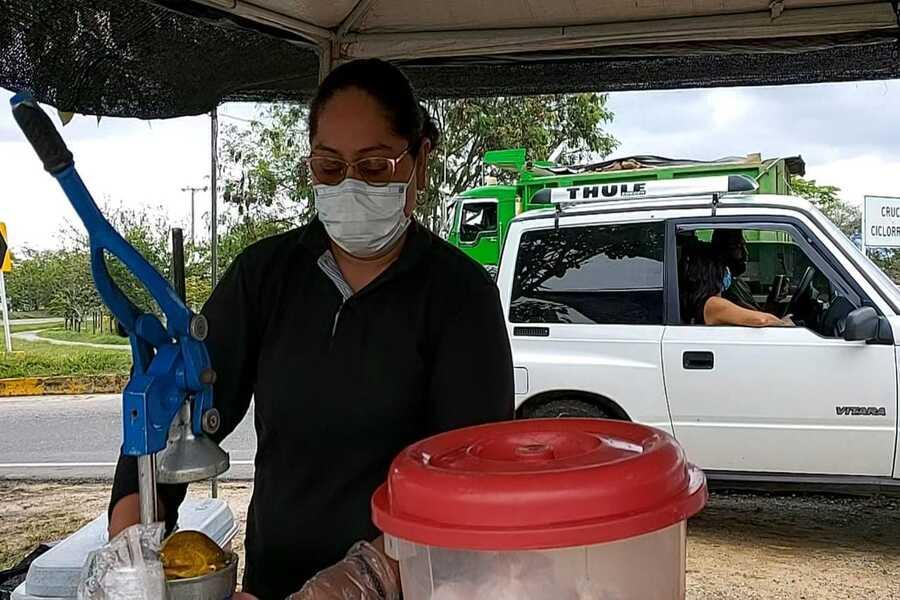 En la glorieta del Aeropuerto Perales de la ciudad de Ibagué, se ubica una mujer que llega todos los días a las 5 de la mañana a trabajar y así vender los diferentes productos que tiene para su clientela, teniendo en cuenta que en esa ubicación y horario muchos ciudadanos madrugan a hacer su rutina de ejercicio por la cicloruta.