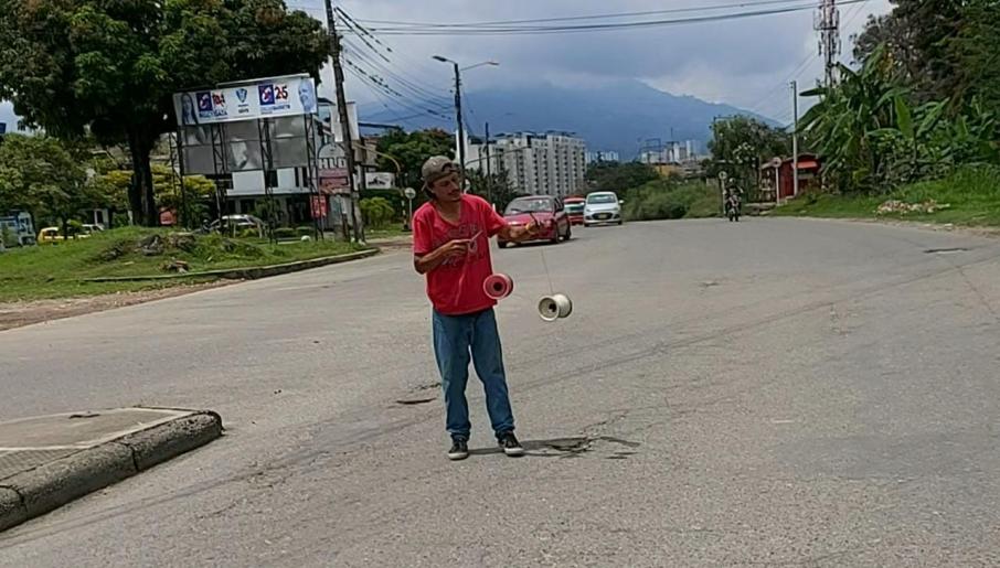 Por lo menos ocho años ha dedicado 'El Merengue' como también es conocido artísticamente en las calles de la Ciudad de los Ocobos, donde espera que el semáforo cambie a rojo, para que los vehículos de servicio público, particulares, de carga pesada y motociclista paren a ver el espectáculo que Luis Felipe Cortés tiene que ellos.