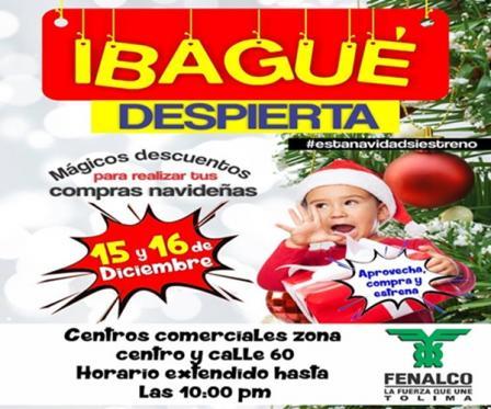 En palabras del director de Fenalco Tolima, Óscar Germán Díaz Enciso, el comercio este fin de semana, viernes 15 y sábado 16 de diciembre, disfrutarán de la campaña ´Ibagué despierta´ donde las cadenas grandes y pequeñas de todo tipo de industrias adscritas a la entidad tendrán sus puertas abiertas al público hasta las 10:00 de la noche, otras irán hasta las 11:00 p.m.