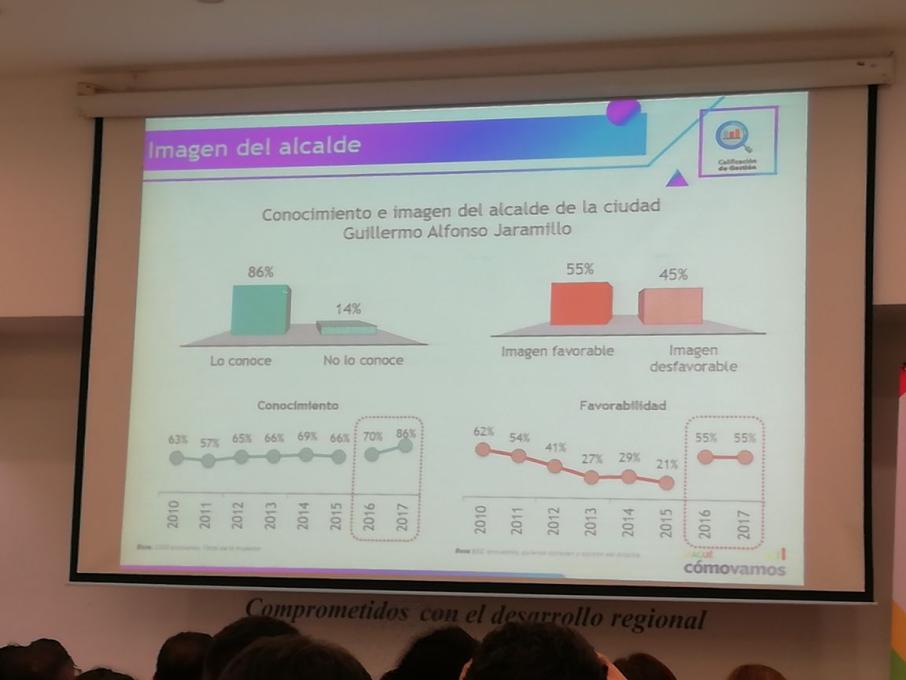 En cuanto a la imagen del alcalde Jaramillo, el coordinador técnico del programa Ibagué Cómo Vamos, comentó que es el mandatario más conocido llegando a un 86% y su favorabilidad se mantuvo constante con respecto al 2016 con un 55%, en cuanto a la calificación de la gestión obtuvo un 38% de los ciudadanos, un aumento del 4% con respecto al anterior.