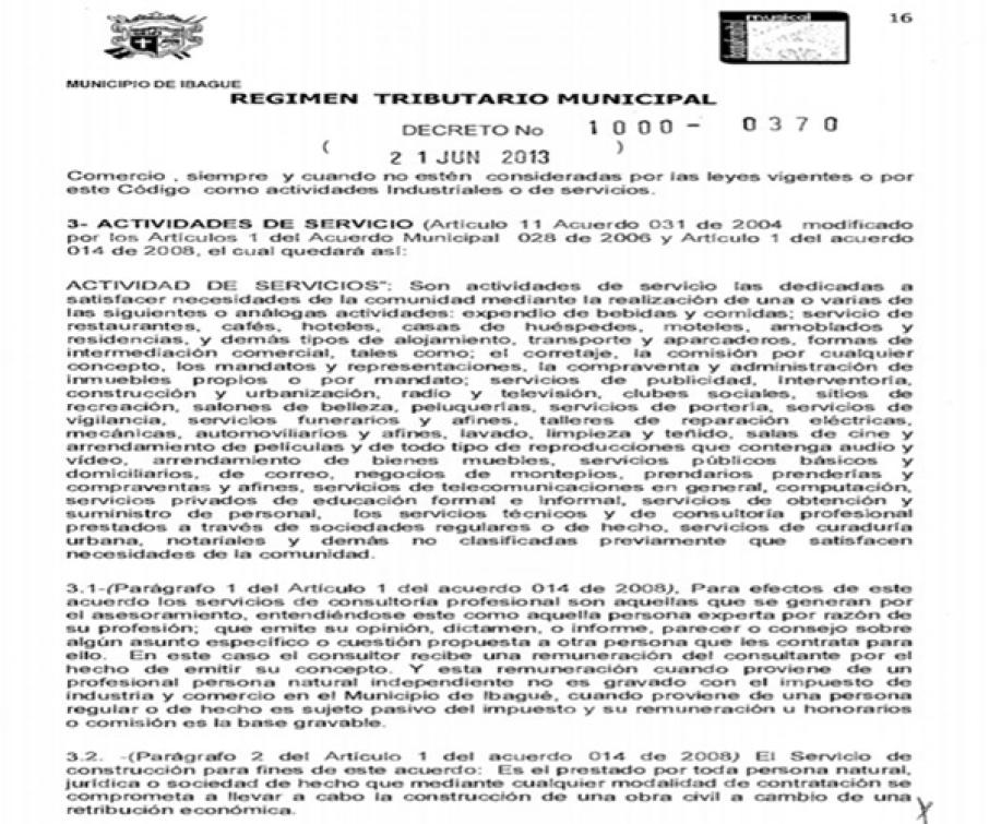 Según el acuerdo 014 del 2008 se prohibió cobrar impuesto de Industria y Comercio a las personas naturales y profesionales de la ciudad, además Ecos del Combeima encontró el decreto compilatorio municipal número 1000-0370 del 21 de junio del 2013 que en el artículo 3.1 habla del acuerdo 014 del 2008 que dice en sus últimos renglones “para efectos de este acuerdo los servicios de consultoría profesional son aquellas que se generan por el asesoramiento, entendiéndose este como aquella persona experta por razón de su profesión que emite su consejo sobre algún asunto especifico a otra persona que lo contrata para ello y esta remuneración cuando proviene de un profesional, persona natural e independiente no es gravado con ICA en el municipio de Ibagué”.