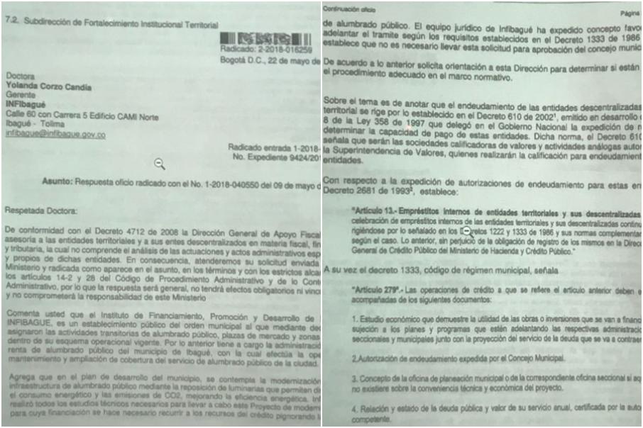 Carlos Castro indicó que efectivamente el documento que tiene como soporte INFIbagué cuenta con el aval del Ministerio de Hacienda para que se actúe sin necesidad de que el proyecto pase por el Concejo Municipal, sin embargo, al parecer dicho concepto está basado en un interrogante mal planteado por el Instituto.