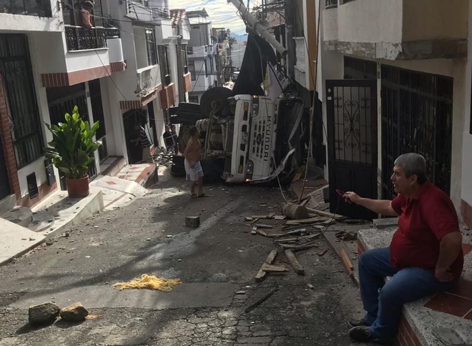 "Cogió en reversa, golpeó una casa y quedó de costado. Solo hubo daños materiales porque afortunadamente los dos operarios que estaban atrás acababan de salir a traer otros elementos de una camioneta que llegó a la parte de arriba", dijo el ciudadano en diálogo con Econoticias.