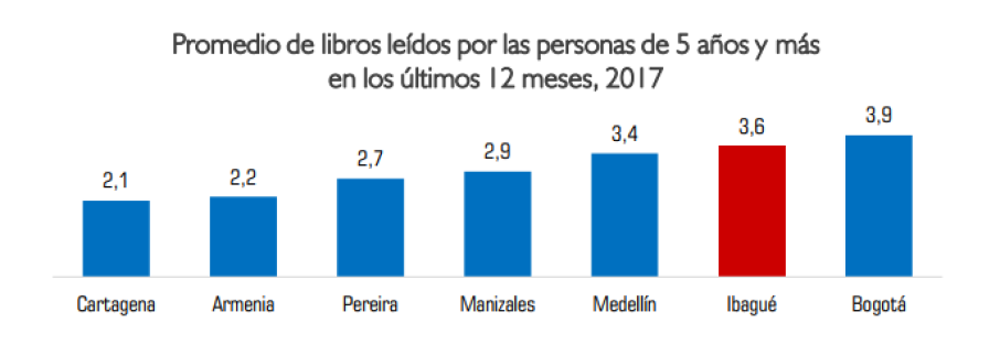 En efecto, según el programa 'Ibagué Cómo Vamos', en la capital de la República los ciudadanos mayores de 5 años de edad leyeron en promedio 3,9 libros durante el último año, seguida por Ibagué con un registro de 3,6 y Medellín con 3,4, mientras que en el último lugar aparece Cartagena con apenas 2,1 en 12 meses.