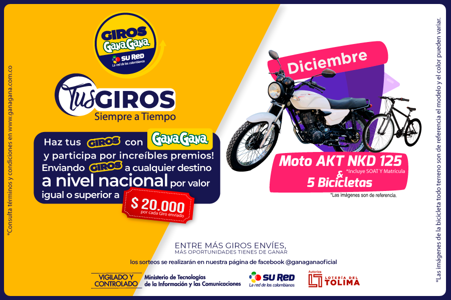 Este mes con el promocional “Tus Giros Siempre a Tiempo” participa en el sorteo de una espectacular moto AKT NKD 125 y por una de las 5 bicicletas, enviando giros iguales o superiores a $20.000 a cualquier destino nacional en cualquiera de nuestros puntos de venta en el departamento del Tolima.