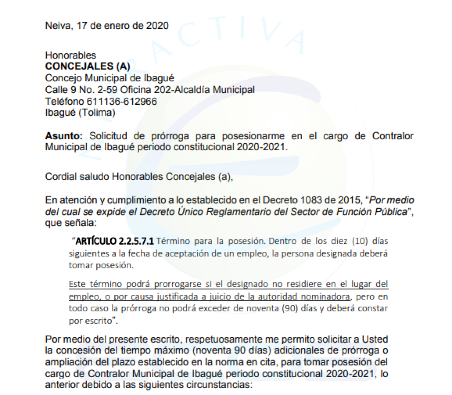 Del mismo modo, Leidy Perea manifiesta en el cierre del documento que en el eventual caso de no requerir la prórroga o superar los procesos en un tiempo inferior al solicitado, inmediatamente informará al Cabildo sobre la 'luz verde' para la posesión.