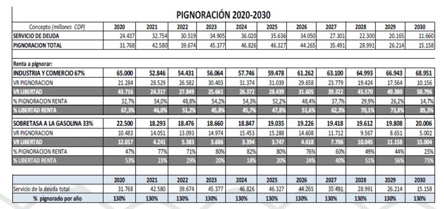 En resumidas cuentas, el municipio pignorará en el 2020 en el caso del impuesto de Industria y Comercio $21.284 millones y en el caso de la sobretasa a la gasolina $10.483 para poder cubrir el 130% de la deuda del 2020 que corresponde a $24 mil millones aproximadamente.