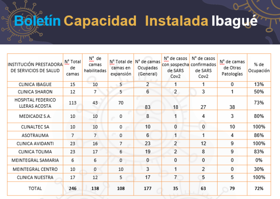 El más reciente boletín de capacidad instalada en la ciudad de Ibagué indica que de las 246 camas (138 UCI y 108 de expansión) disponibles en unidades de cuidados intensivos para adultos, 177 permanecen ocupadas y 69 está disponibles.