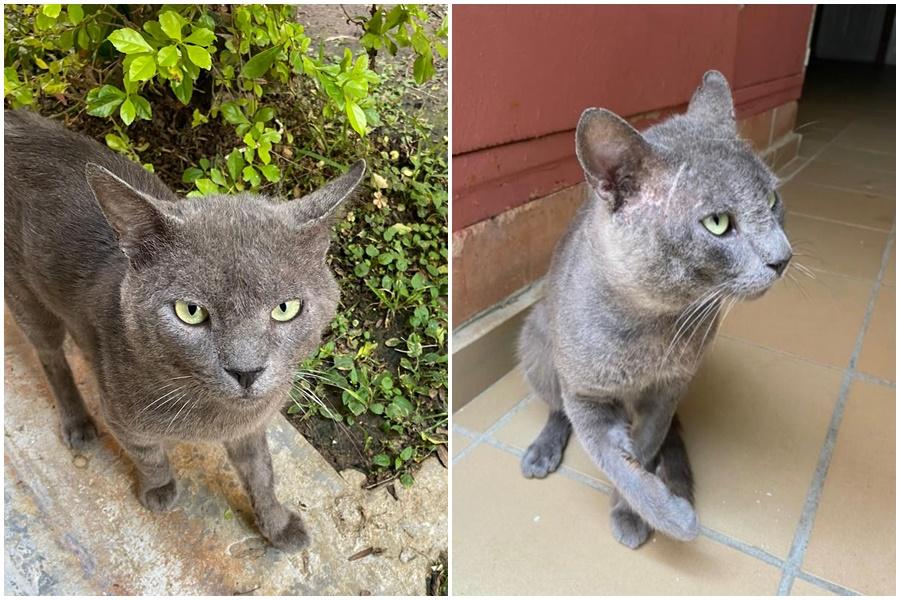 En medio de una pandemia, un paro indefinido y el abandono a diario de mascotas, aparecen en nuestra puerta, seres maravillosos e inocentes que piden a gritos auxilio desesperado. Gris, es un gato que lleva meses en mi conjunto, y en medio de la indiferencia de muchos, ha pasado por problemas de piel, de vecinos que los ahuyentan con agua en medio de la noche fría y la indolencia. Tuvo serias heridas de cuello por sus peleas nocturnas. Sin embargo, la Doctora Liliana Garrido de la veterinaria «Más Mascotas», en un acto de amor y generosidad lo esterilizó, desparasitó y bañó. Pese a eso y la medicina para los ácaros, su piel no ha logrado mejorar del todo debido a las condiciones de calle en la que se encuentra, y al parecer, tiene un hongo. Aunque en los gatos, el hongo en la piel no resulta grave, sí es muy incómodo y tedioso, sobre todo para un animal que no goza de los cuidados de un hogar. Con mi hija y unas vecinas, lo alimentamos; yo le he dado algunas medicinas y procuramos ayudarlo, pero en mi caso, no lo puedo adoptar aunque quisiera, ya que tengo tres gatos más