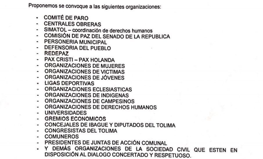 "Somos conocedores de la buena voluntad que le asiste al alcalde Andrés Fabián Hurtado de escuchar y generar espacios de concertación y diálogo entre los distintos actores de la sociedad civil en Ibagué", dice una parte del documento.