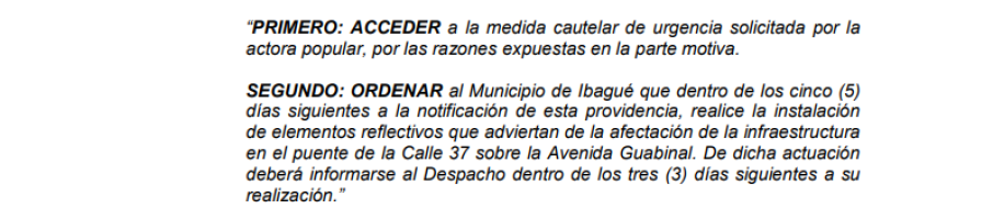 La Personería Municipal de Ibagué le envió un oficio al Juzgado Tercero Administrativo del Circuito en el que advierte que la Alcaldía no le ha dado cumplimiento a la orden de instalar elementos de señalización que alerten sobre el mal estado en que se encuentra el puente ubicado en la calle 37 con avenida Guabinal.