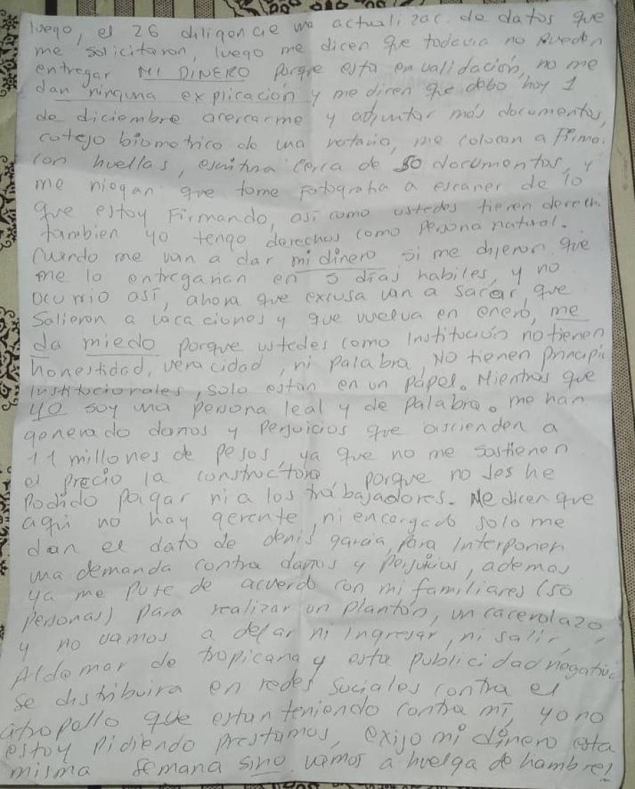 Lo cierto es que tanto el señor Juan Miguel Ramírez y su esposa María Carolina Ferreira han intentado acudir a diferentes entidades oficiales que los pueda asesorar en el caso y poder saber qué hacer frente a la aparente actitud negligente del Fondo Nacional del Ahorro, pues de momento la pareja de esposos se encuentra en una crisis económica y lo que parecía ser su ‘salvavidas económico’ es incierto si lo podrán recuperar.
