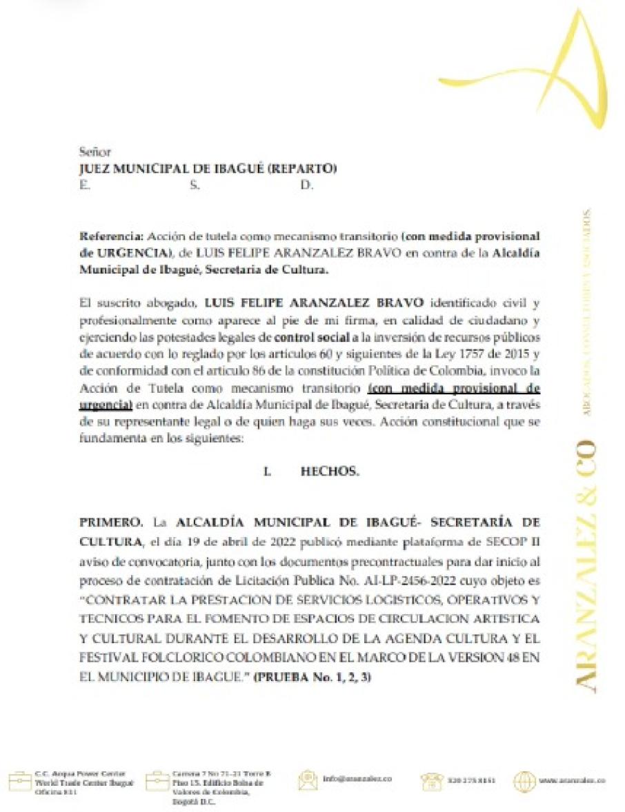 De acuerdo con el abogado, los costos que se van a destinar para las fiestas en Ibagué, sería lo que llamó su atención, por lo que investigó a profundidad este caso debido a los costos de incentivos que se van a pagar.