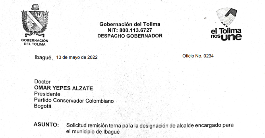 Mediante oficio dirigido al presidente del Partido Conservador, Ómar Yepes Alzate, el gobernador Ricardo Orozco había solicitado desde el pasado 13 de marzo "remitir terna por parte del movimiento político con el fin de proceder a designar alcalde encargado".