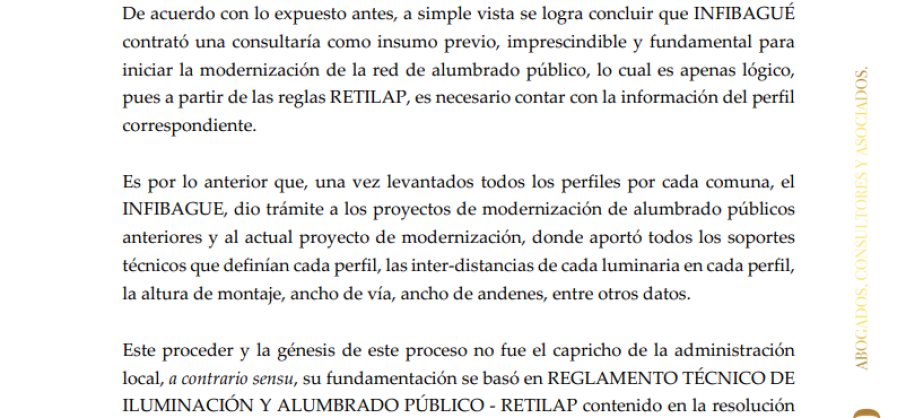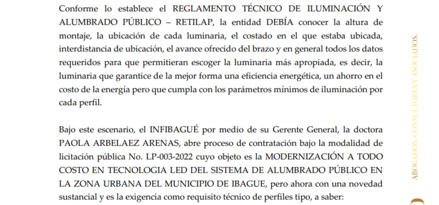 Por último y como aspecto de mayores relevancia, Luis Felipe Aranzales asegura que Infibagué ni siquiera contaba con información de topografía, corredores viales, zonas de iluminación, presupuesto probable, lugares de operación de la red y otros aspectos necesarios para contratar la iluminación.