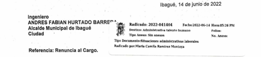 No obstante, el documento que obtuvo en exclusiva Ecos del Combeima, además de mencionar los logros del Gobierno Municipal bajo la 'batuta' de Hurtado, no expone los motivos por los cuales la hoy exfuncionaria decidió dar un paso al costado a poco más de un año de terminar el periodo gubernamental.