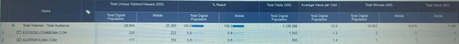 Según Comscore, ecodelcombeima.com tuvo un alcance multiplataforma de 235 mil personas (reales) durante julio del 2022, seguido -con amplia ventaja- por Alerta Tolima y El Nuevo Día. Sin embargo, el reporte de visitas al portal entre el 1 y 31 de agosto, de acuerdo con Google Analytics, establece 1.805.926.