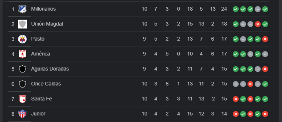 Millonarios, con 24 puntos, está a solo seis unidades de asegurar su clasificación, pero la sorpresa la protagonizan Unión Magdalena y Deportivo Pasto al ocupar el segundo puesto y tercer puesto respectivamente.