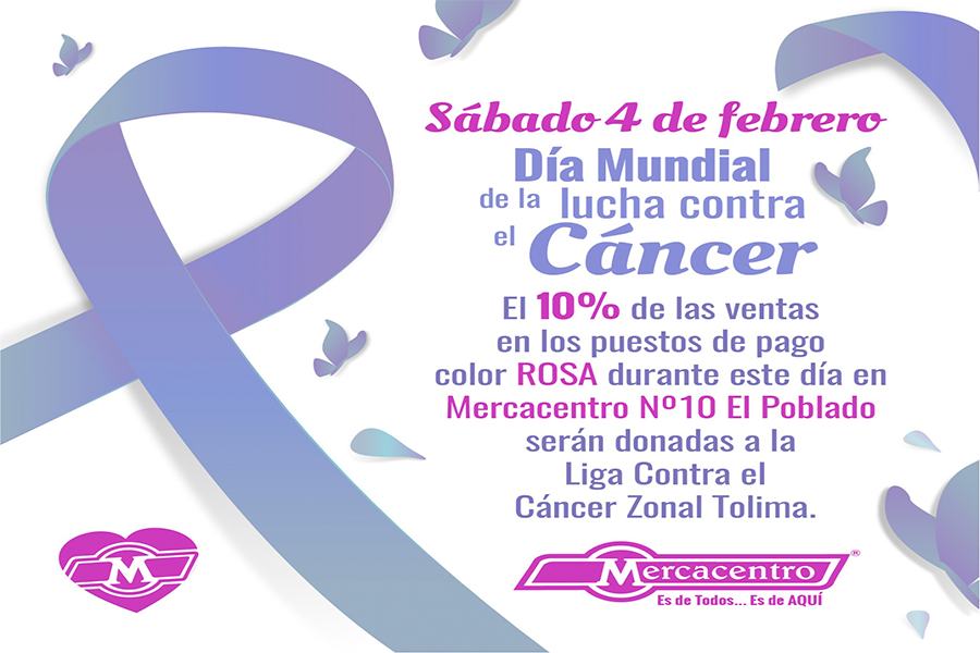 Mercacentro se une a esta lucha, la cual es de todos, y por ello durante este día donará el 10% de las ventas que se realicen en los puestos de pago de color rosa en su punto de venta N°10 ubicado en el Poblado. El monto recaudado será donado a la Liga Contra el Cáncer Zonal Tolima.