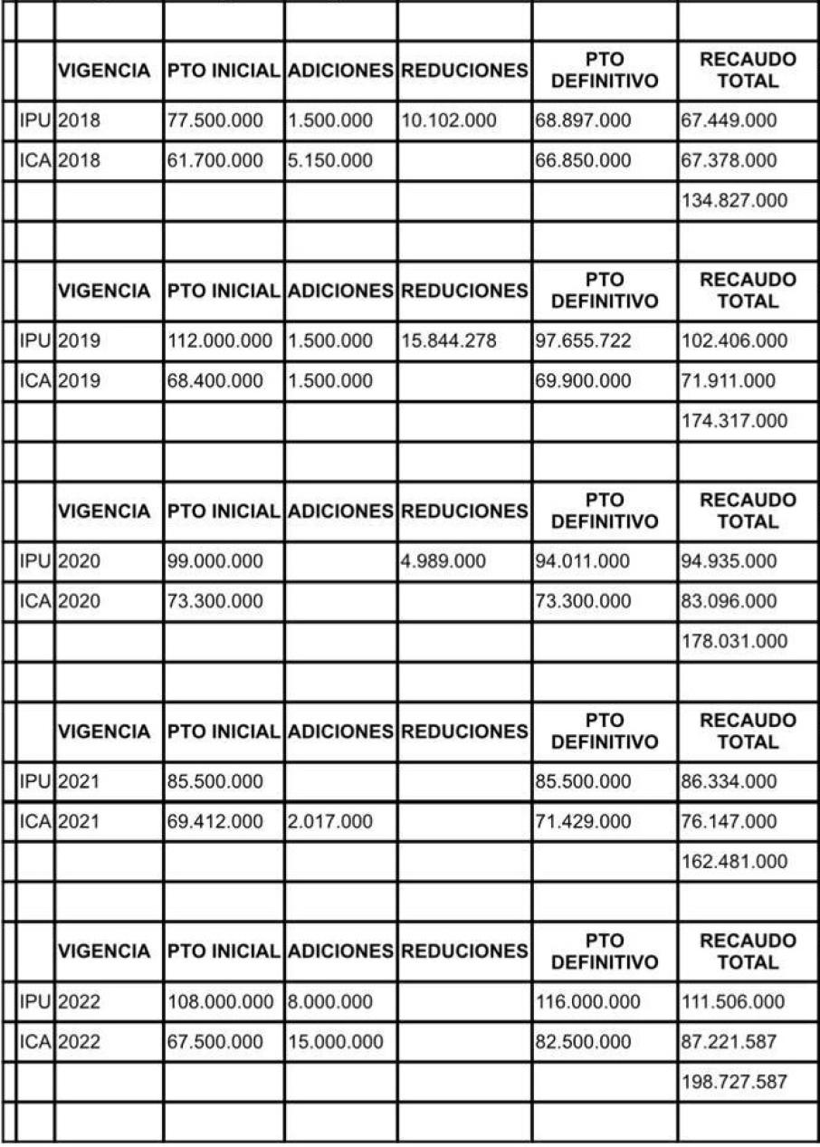 Presupuesto por vigencia de IPU (Impuesto Predial Unificado) e ICA (Industria y Comercio)