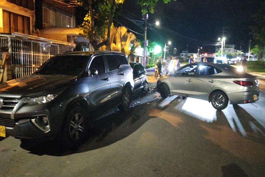 En la madrugada del pasado domingo en el sector del Pedregal se presentó un incidente, donde se vieron involucrados 3 vehículos que colisionaron sobre la avenida Ambalá. Al parecer, un vehículo Hyundai Accent de color plata estrellaría un vehículo negro que se encontraba parqueado en esa zona, rebotándolo contra una camioneta Toyota que estaba estacionada más adelante.