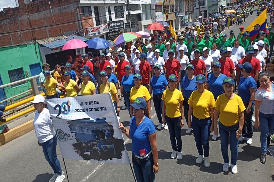 Los líderes de las JAC de Ibagué se integraron al desfile conmemorativo del 20 de julio para mostrar su apoyo incondicional al Ejército Nacional, a la Policía Nacional, a las fuerzas armadas, a las víctimas del conflicto armado y a toda la comunidad en general. La manifestación fue encabezada por integrantes de la Junta de Acción Comunal de las diferentes comunas de la ciudad, quienes expresaron su compromiso con el progreso de Ibagué y el bienestar de las comunidades.